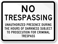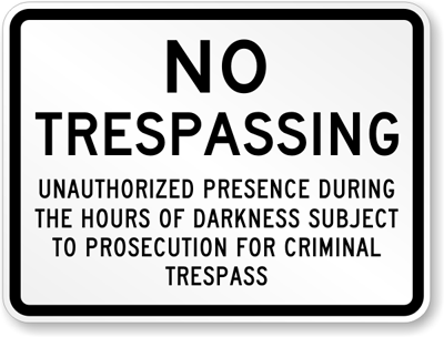 No Trespassing Sign: Unauthorized Presence During The Hours Of Darkness Subject To Prosecution For Criminal Trespass K-4412 Learn More...