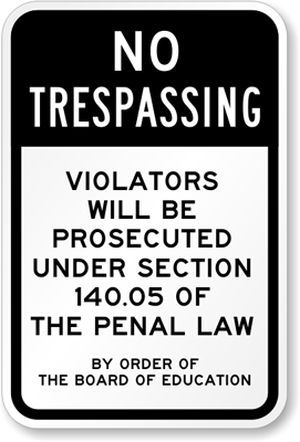 School No Trespassing Sign: Violators Will Be Prosecuted Under Section 140.05 Of The Penal Law (NY State Law) K-4429 Learn More...