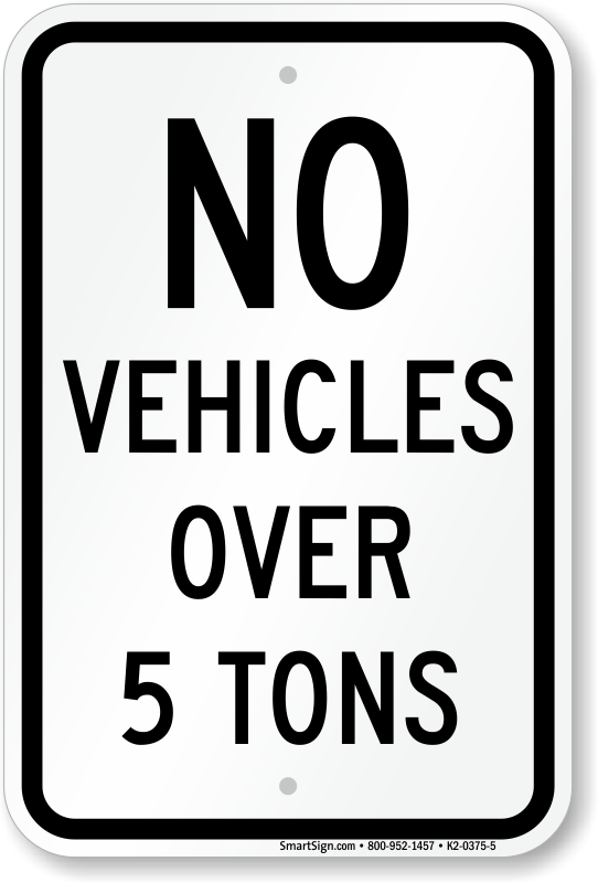 Post No Vehicles Over 5 Tons weight restriction sign to inform drivers not to use the road if the total weight of their vehicle, including the load, is the same or heavier than the weight limit mentioned on the sign.