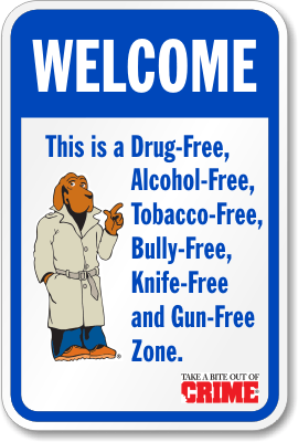 McGruff Security Prohibition Sign: Welcome - This is a Drug-Free, Alcohol-Free, Tobacco-Free, Bully-Free, Knife-Free and Gun-Free Zone K-2557 Learn More...