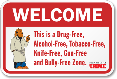 McGruff Security Prohibition Sign: Welcome - This is a Drug Free, Alcohol Free, Tobacco Free, Knife-Free, Gun-Free And Bully-Free Zone With Graphic K-2559 Learn More...