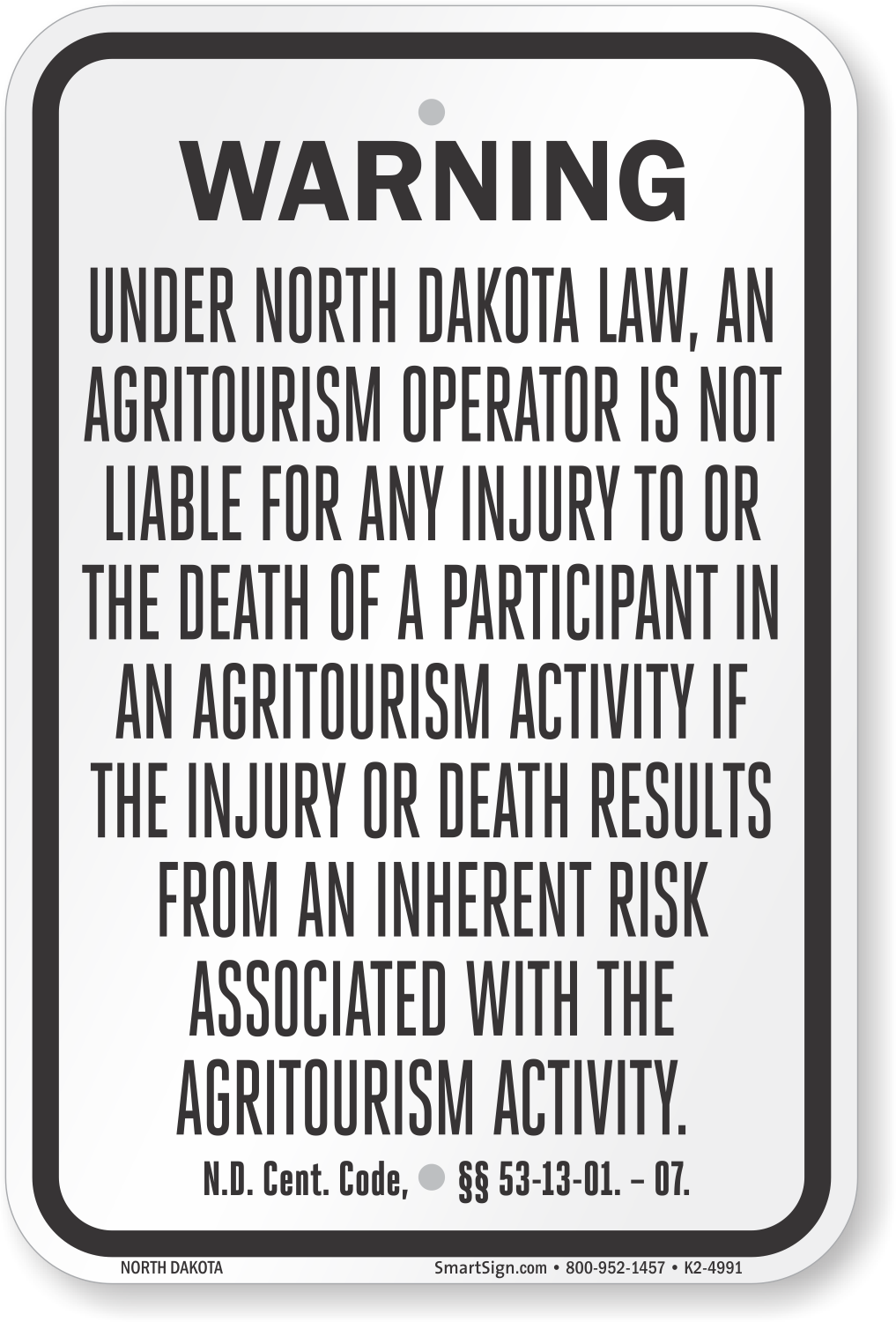 North Dakota Agritourism Liability Sign: Warning - Under North Dakota Law, An Agritourism Operator Is Not Liable For Any Injury To Or The Death Of A Participant In An Agritourism Activity. N.D. Cent.... K2-4991 Learn More...