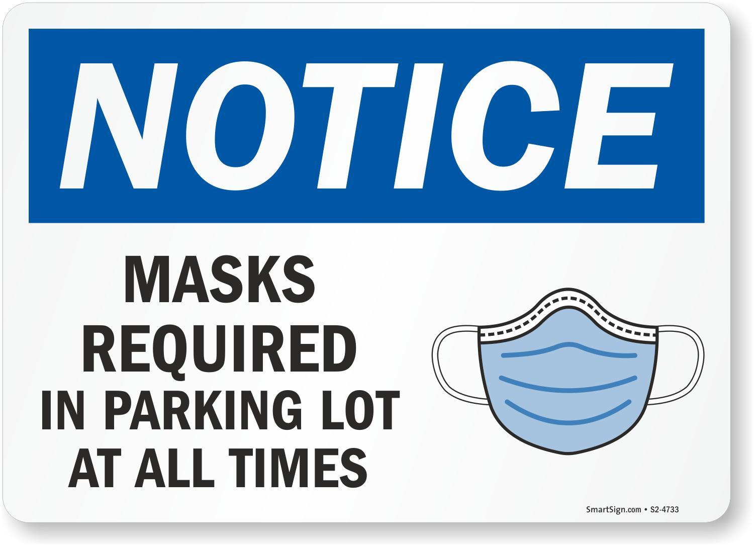 Horizontal Rigid Sign: NOTICE: Masks Required in Parking Lot at All Times S2-4733