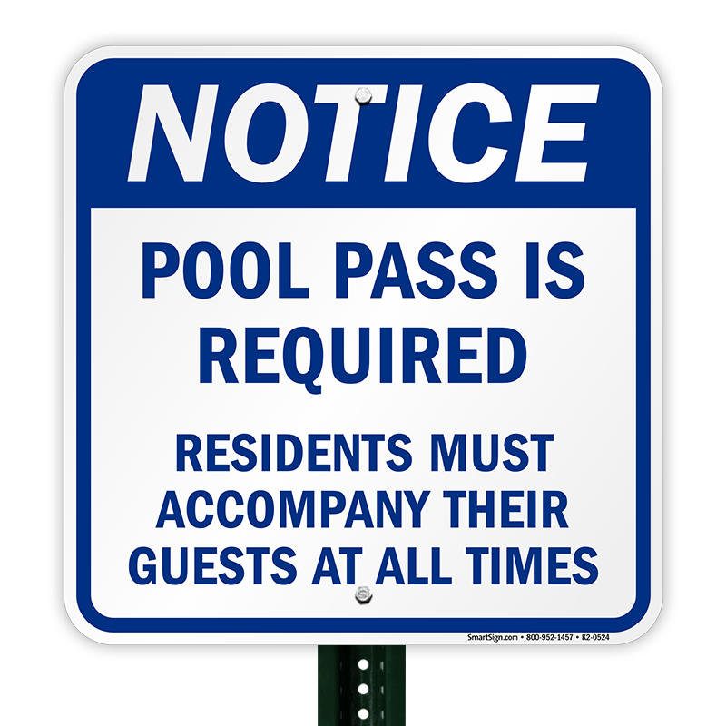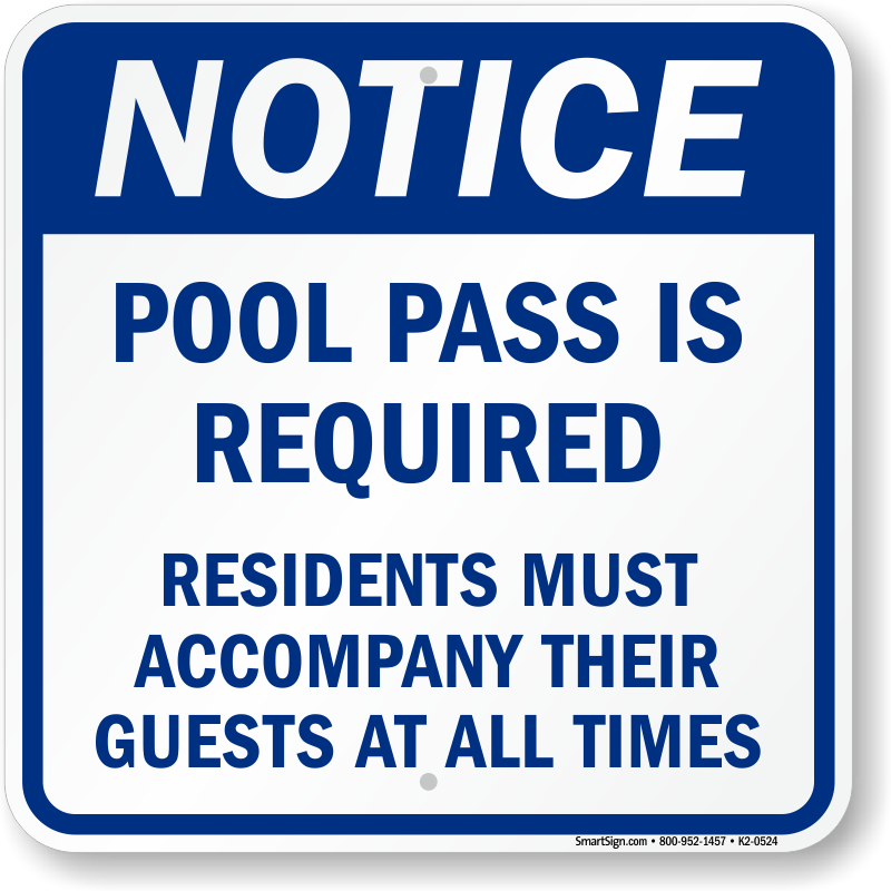 Pool Safety Sign: Notice, Pool Pass is required, Residents must Accompany Guests at all Times K2-0524 Learn More...