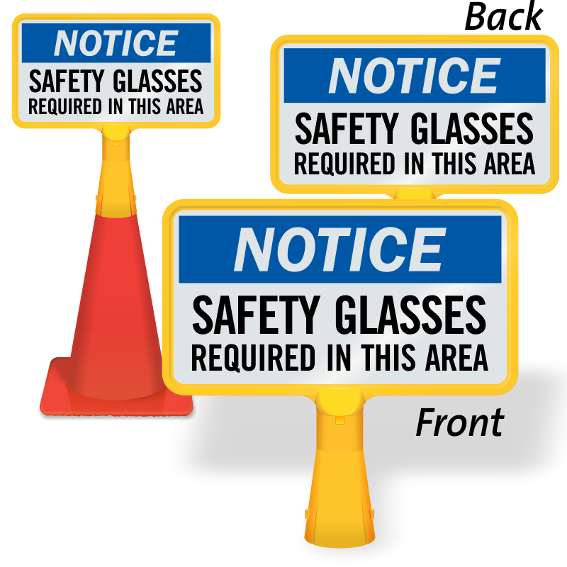 Use this highly-visible no-tip, portable Traffic Cone Sign to remind workers or employees to use eye protection in that area. Choose between 1-sided and 2-sided cone sign.