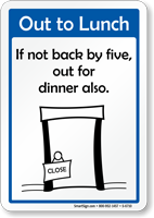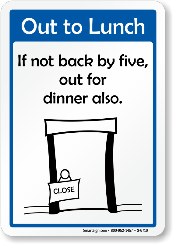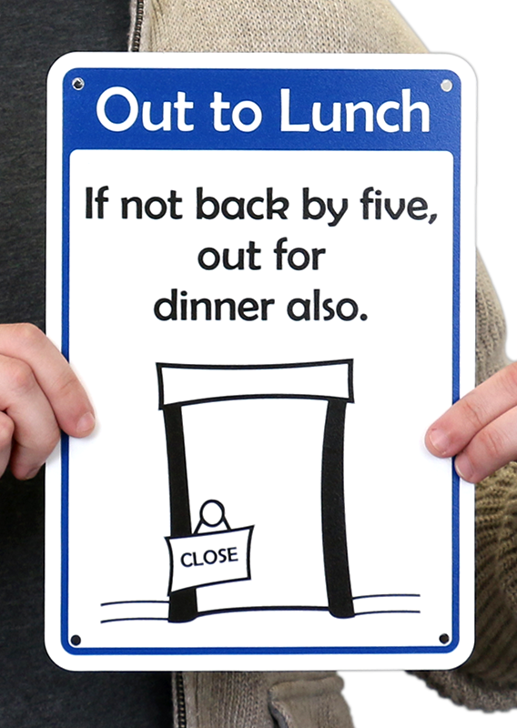 Want to get something a little bit different? Make your sign stand out - a smile makes people feel better! Humorous Sign “Out to Lunch: If not Back by Five, Out for Dinner Also” is a great way to convey your message.