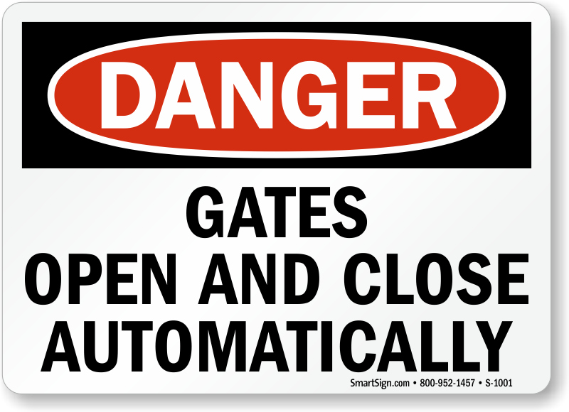 Don't let the door hit you on the way out. This danger sign lets workers and visitors know the gates open and close on their own.