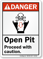 Open pit should be marked with a bold sign. This ANSI Danger Sign has an alarming message and graphic.