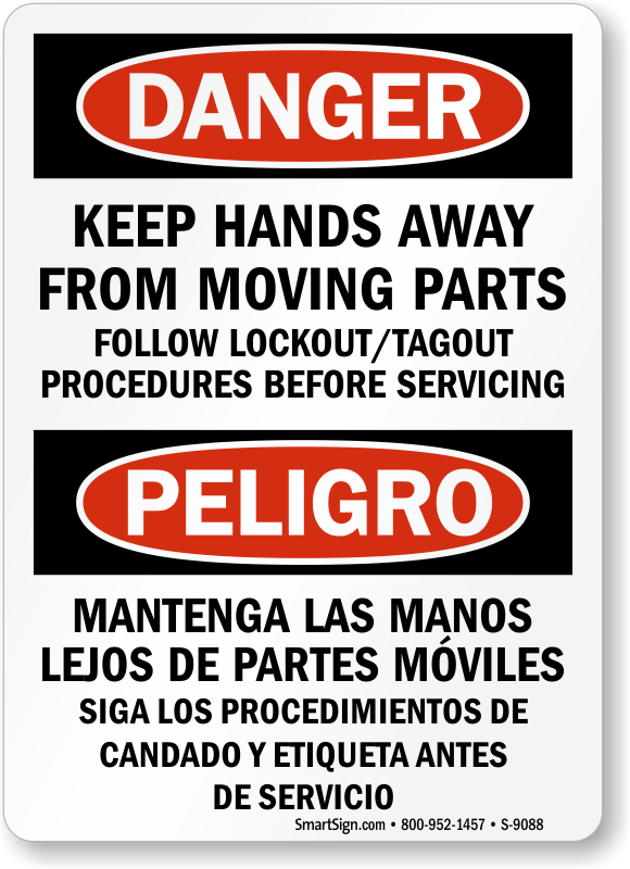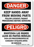 When servicing your facilities, workers could be endangered by close proximity to machinery. Use this bilingual sign to inform both English and Spanish speakers to keep their hands away from moving parts and follow lockout and tagout procedures.