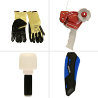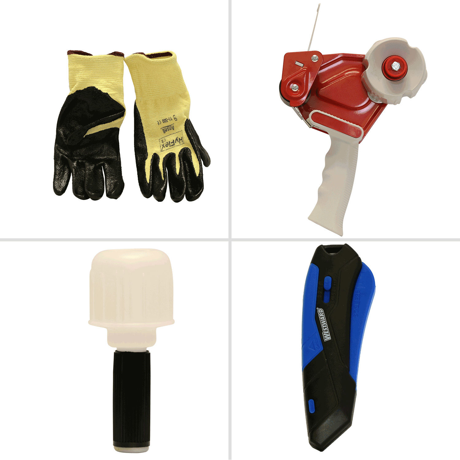 • The kit includes packaging tools (2 tape guns, box cutter, stretch wrap dispenser, gloves, and pen bin) and zinc-plated hook hardware for hanging tools.