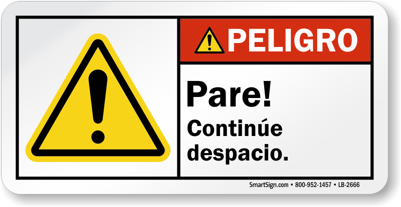This ANSI Peligro label will address forklift drivers in Spanish. Apply this and instruct them to stop and continue slowly.