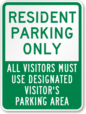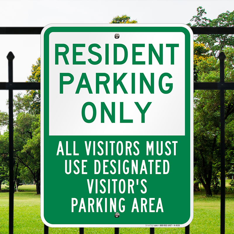 Parking Sign: Resident Parking Only, All Visitors Must Use Designated Visitors Parking Area K-4115 Learn More...