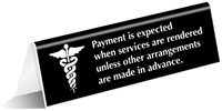 OfficePalâ„¢ Tabletop Tent Sign: Payment Is Expected When Services Are Rendered Unless Other Arrangements Are Made In Advance With Caduceus Graphic SE-5678
