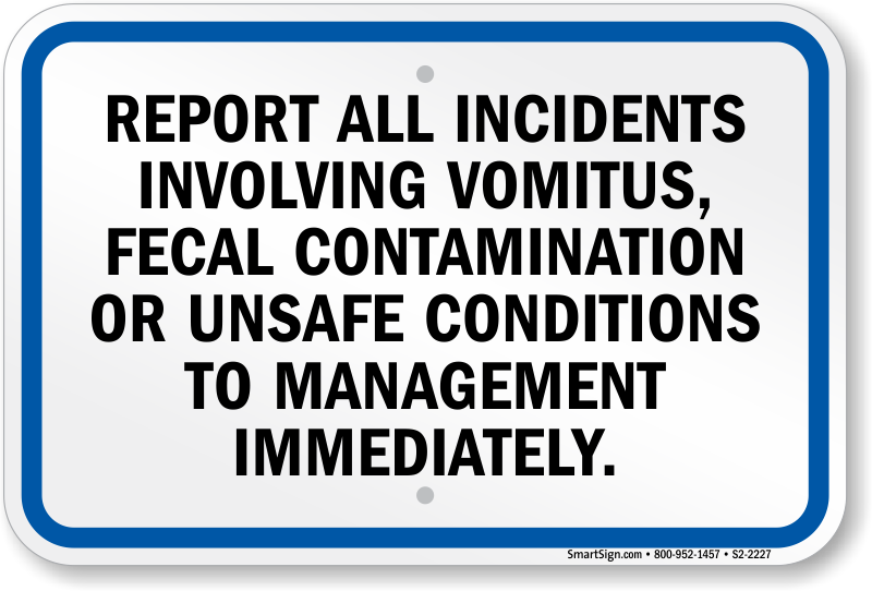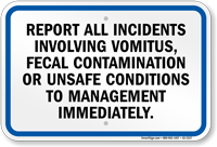 Pennsylvania (Allegheny County) Pool Sign: Report all Incidents Involving Vomitus, Fecal Contamination Or Unsafe Conditions To Management Immediately S2-2227 Learn More...