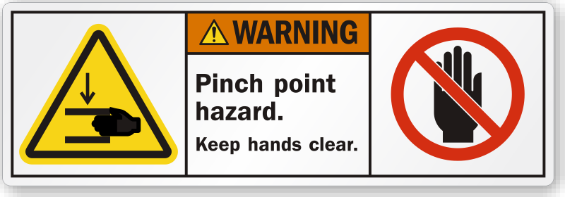 Visual representation of hazards make your message more comprehensible. Use this ANSI Caution Label with two pictograms to warn against pinch point hazards.