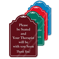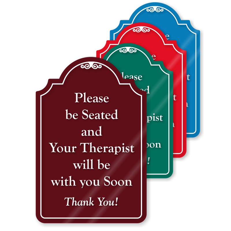 Post this eye-catching designer sign to request everyone to be seated till the therapist arrives.