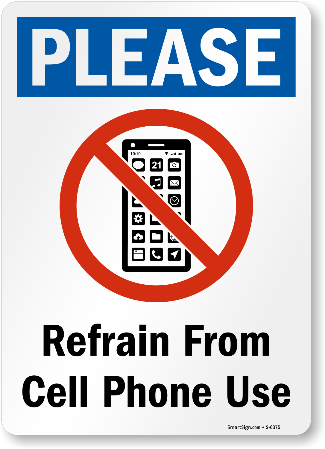 This sign politely asks everyone to hold off on cell phone use. The bold no cell phone graphic illustrates the message clearly on a heavy duty sign.