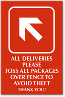 Combat porch piracy! This Anti-Theft Sign conveys delivery personnel to toss packages over the fence and just not leave them outside the property as that may invite package thieves. This engraved sign works well outdoors.