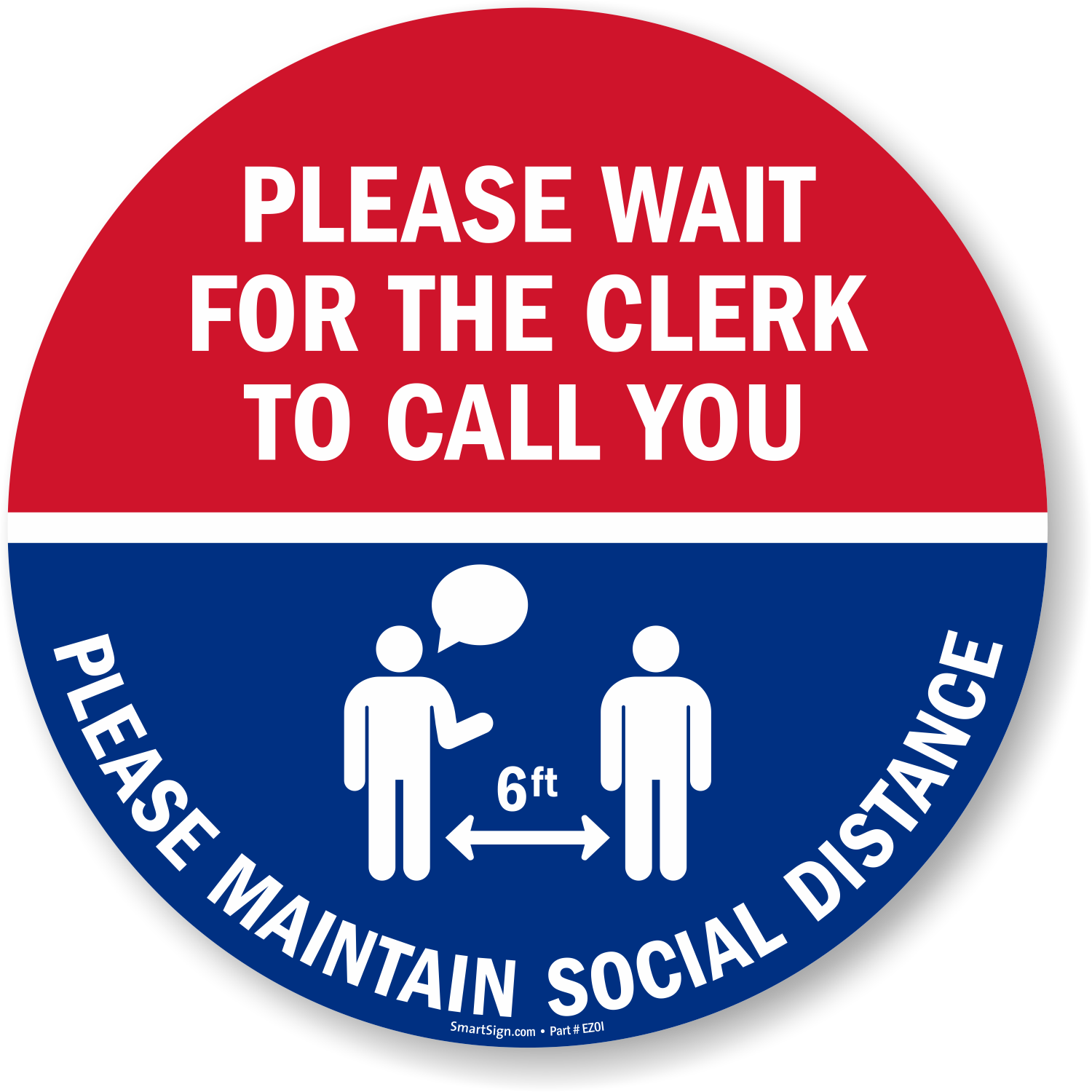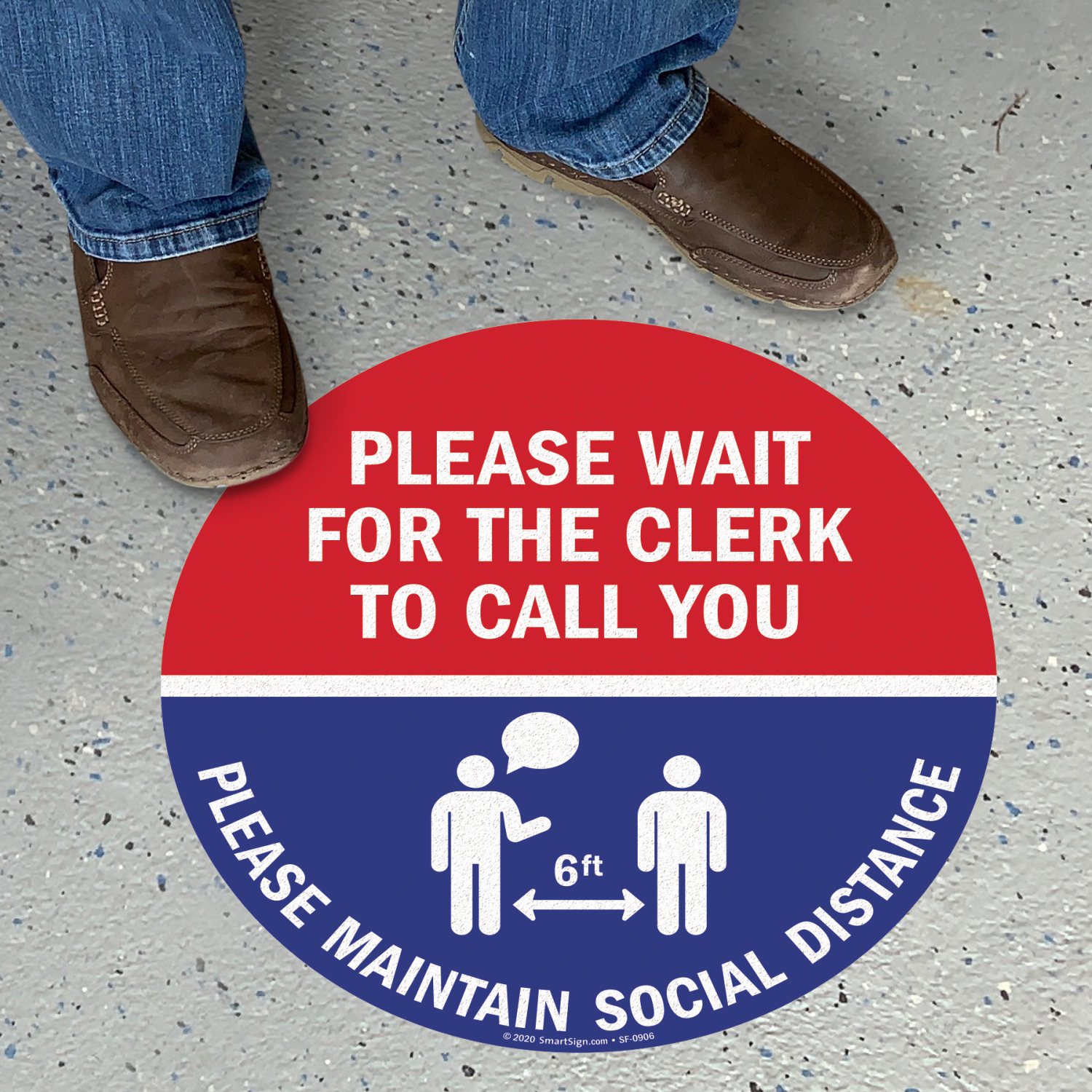 SlipSafeâ„¢ Floor Sign: Please Wait For The Clerk To Call You, Maintain Social Distance Learn More...