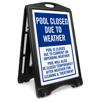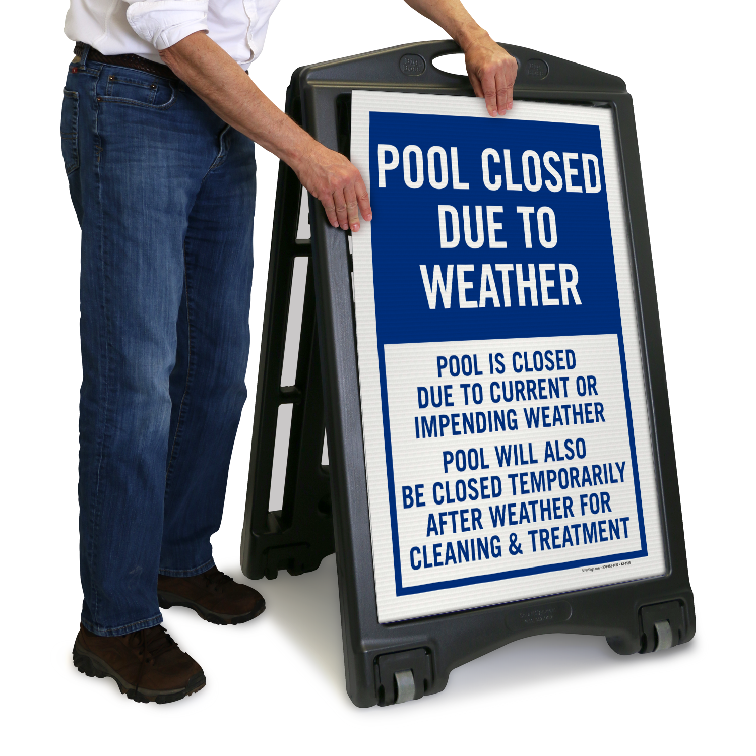 A-Frame Portable Sidewalk Sign: Pool Closed Due To Weather, Pool Is Closed Due To Current Or Impending Weather, Pool Will Also Be Closed Temporarily After Weather For Cleaning and Treatment K-ROLL-1197