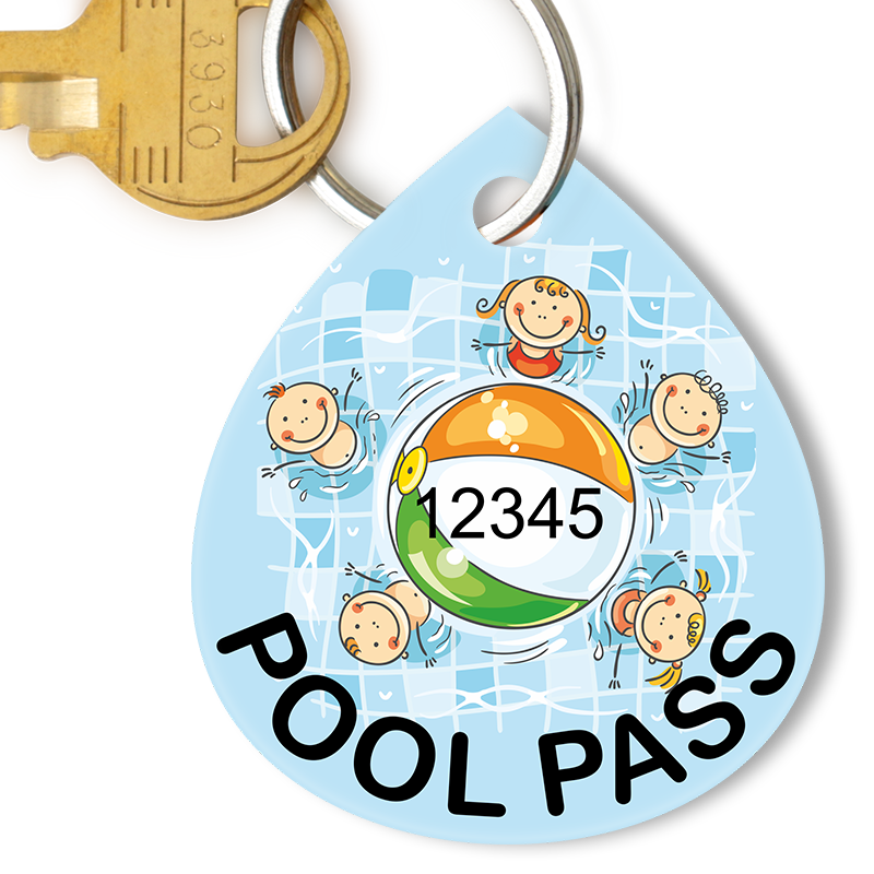 Pool Pass Tag with Consecutive Numbers: Water Drop Pool Pass Kids and Pool Ball Design (Key Ring/Companion Product) TG-1355