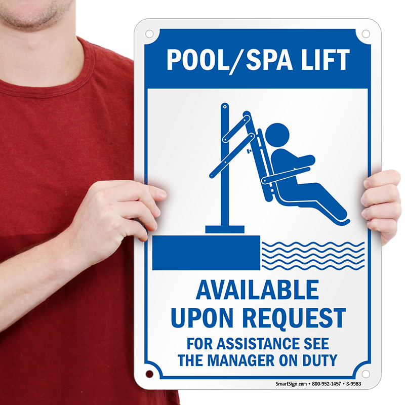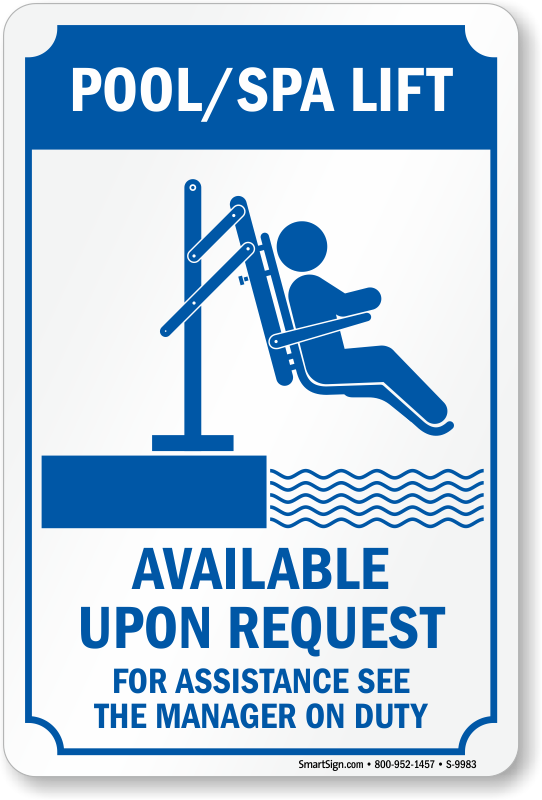 New ADA rules require pool and spa owners to fit pools with mechanical chair lifts in order to make them more accessible for disabled guests. Inform your guests about the availability of spa and pool lifts with our Pool/Spa Lift Available Upon Request Sign.