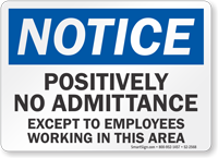 OSHA Notice Sign: Positively No Admittance, Except To Employees Working In This Area S2-2568