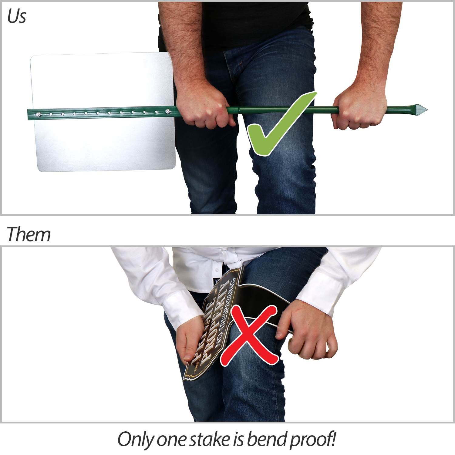 Heavy-duty, bend-proof stake with flanged support tabs and a pointed insert end.