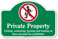 Dome-Top Sign: Private Property - Fishing, Swimming, Hunting And Boating On These Grounds Are Prohibited. K2-5141 Learn More...