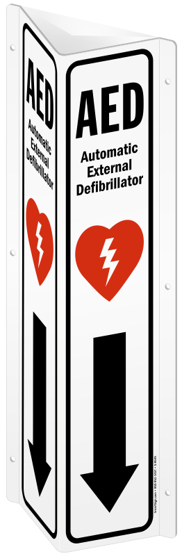 Projecting Sign: AED, Automatic External Defibrillator (with Down Arrow & Graphic)