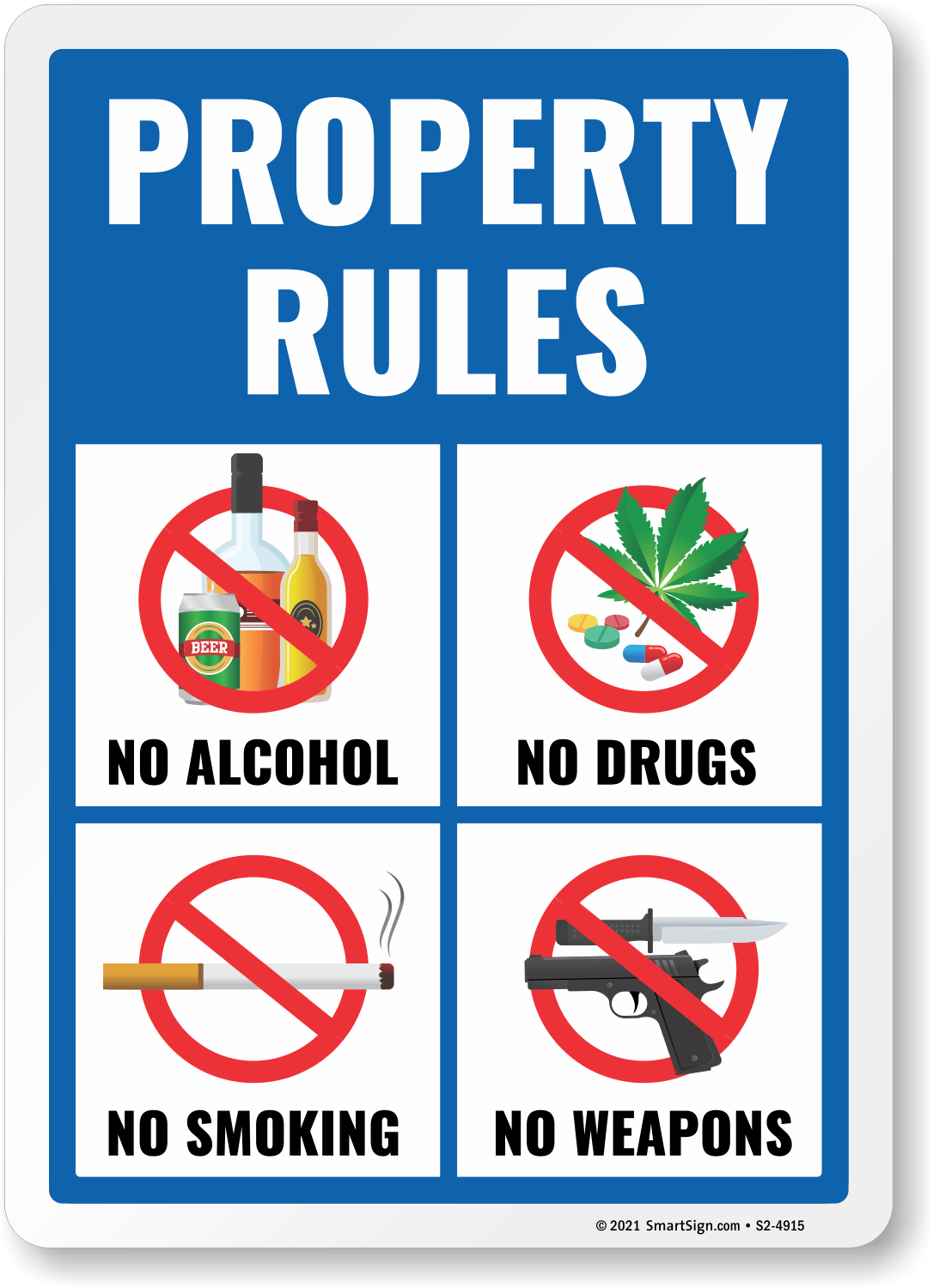 Property Rules Sign: Property Rules: No Alcohol, No Drugs, No Smoking, No Weapons S2-4915