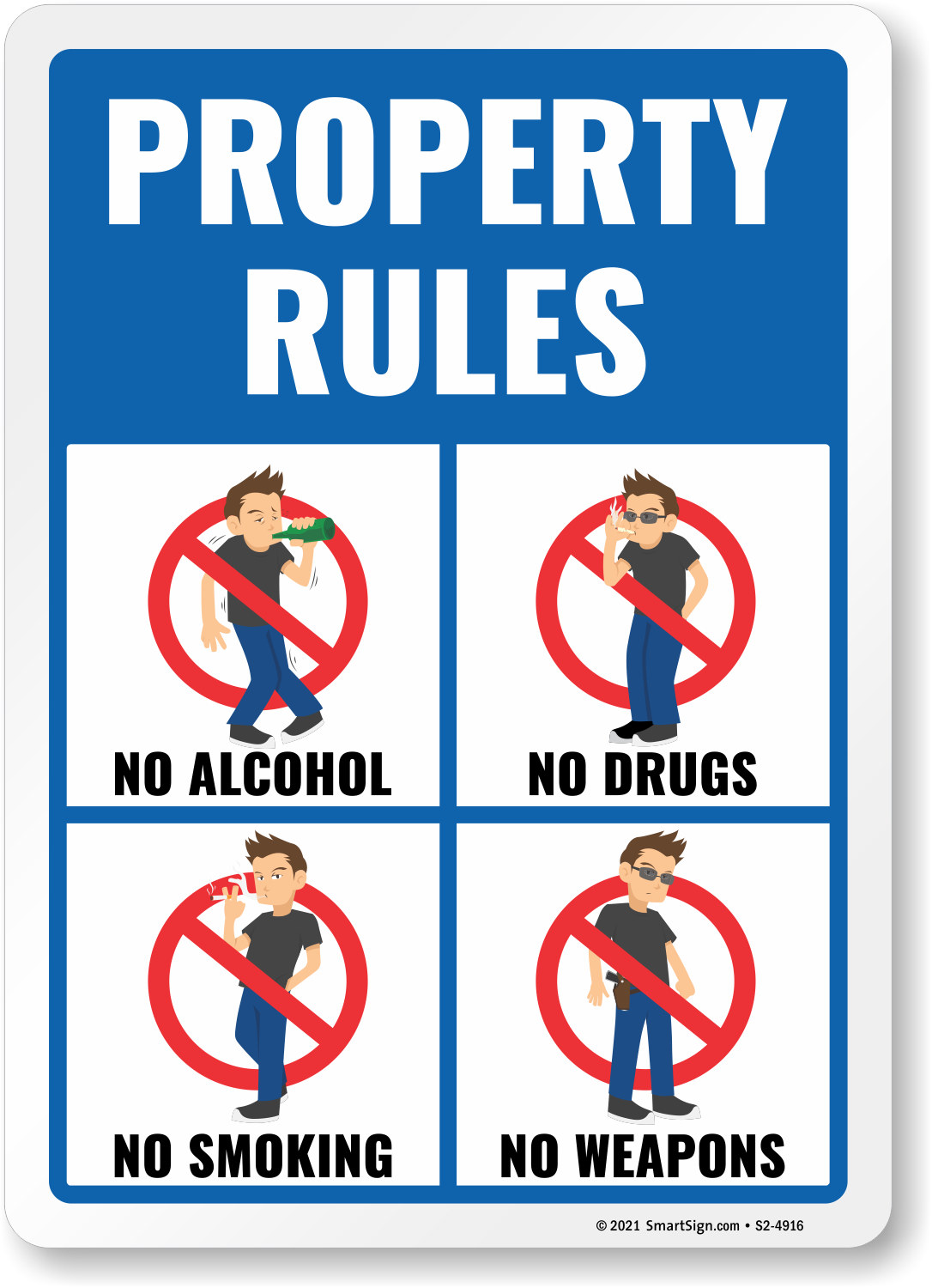 Property Rules Sign: Property Rules: No Alcohol, No Drugs, No Smoking, No Weapons S2-4916