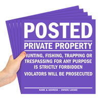 Private Property HDPE Sign Pack: Purple Posted Private Property Hunting, Fishing, Trapping or Trespassing Violators Will be Prosecuted KT-0036 Learn More...