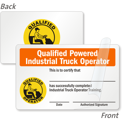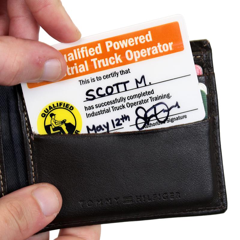 Issue this double-sided Certification Wallet Card to employees qualifying powered industrial truck operator training. Easily write-on the information using a pen or a marker. Lamination seals in your writing and protects the card against dirt, scratches, moisture and chemical spills.