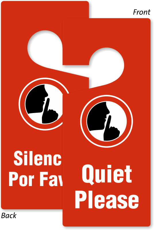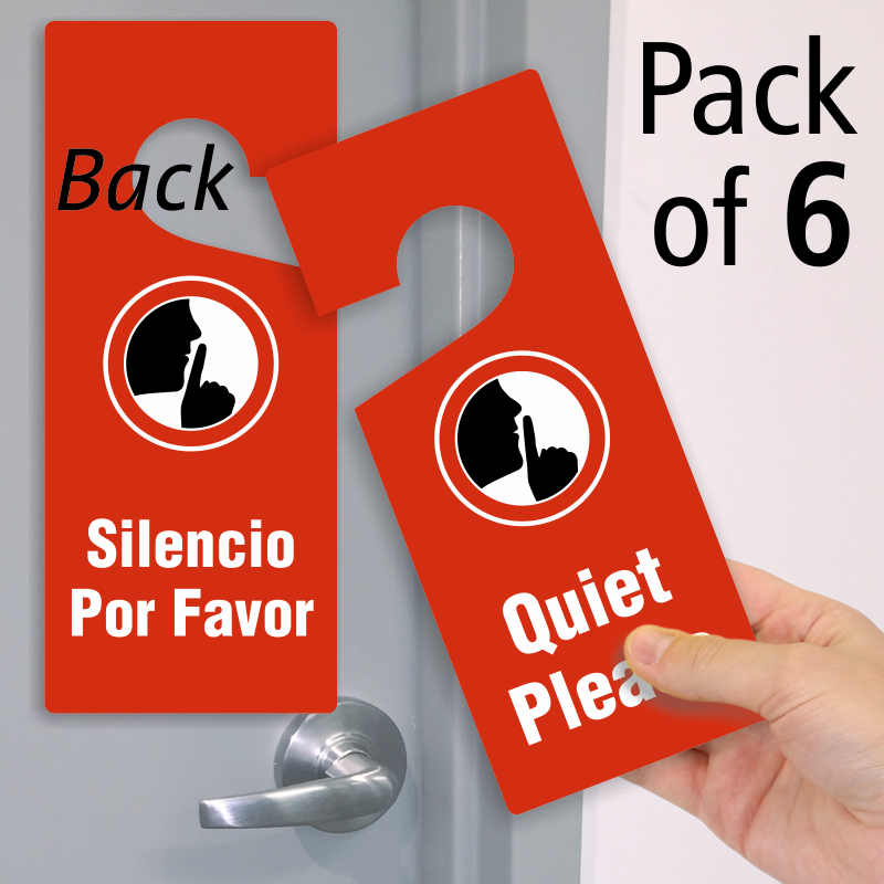 Using this door sign you can ask people to maintain silence. The hang tag reads quiet please in English and Spanish, on each side respectively along with a graphic. Can be used in offices, hotels, or home.
