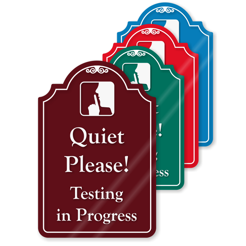 Politely request individuals to stay quiet and avoid interruptions during testing process with our eye-catching designer sign.