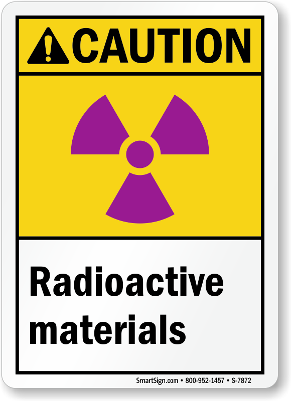 Purple radioactive graphic over a yellow Caution background and legend.