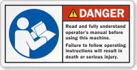 Remind workers that it's unsafe to operate a machine without reading its operator's manual. Use this ANSI danger label and ask them to go through the instructions first.