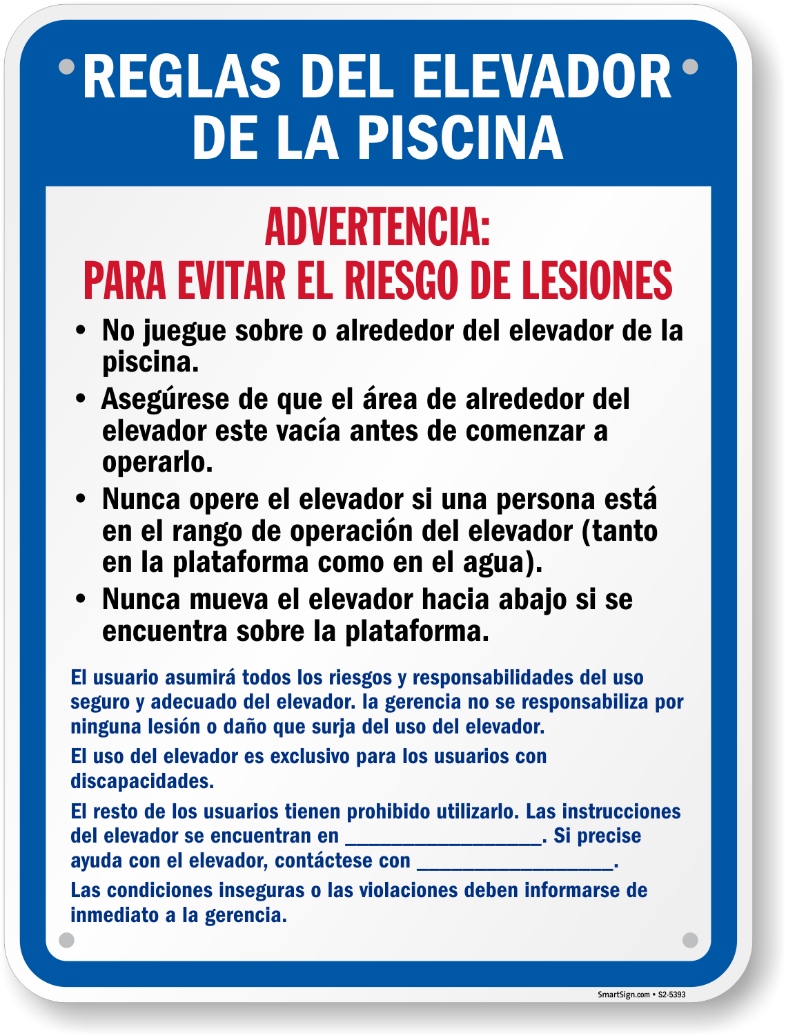 Spanish Pool Rules Sign: Reglas Del Elevador De La Piscina : Advertencia Para Evitar El De Lesiones S2-5393 Learn More...