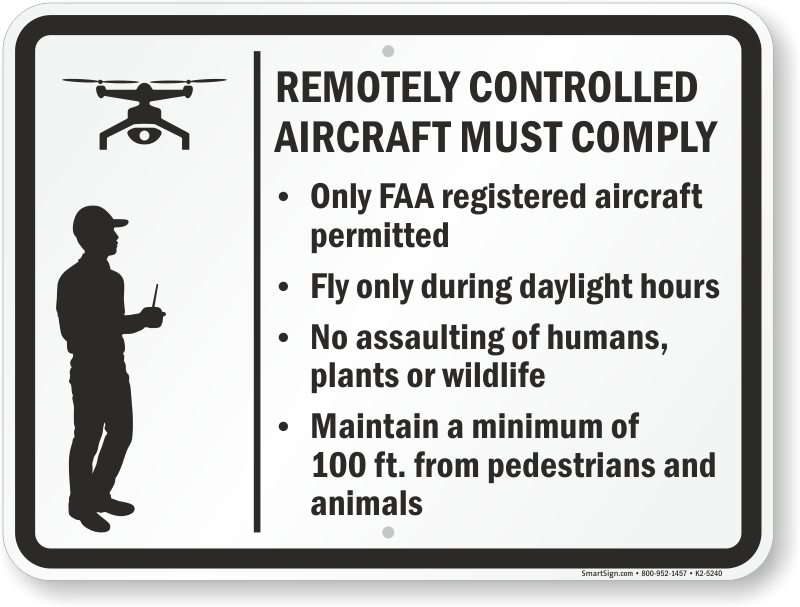 Drone Liability Rules Sign: Remotely Controlled Aircraft Must Comply - FAA Registered Aircrafts Only K2-5240