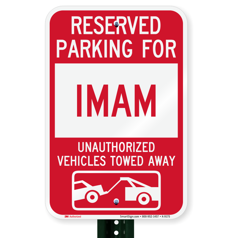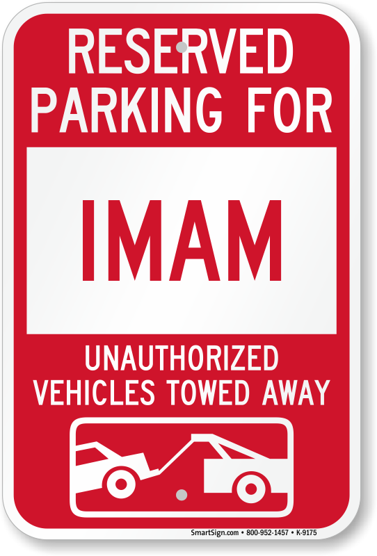 Parking Lot Sign: Reserved Parking For Imam Unauthorized Vehicles Towed Away (With Tow Away Graphic) K-9175 Learn More...