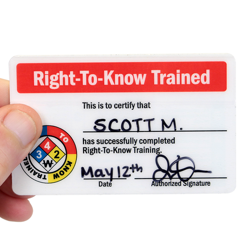 Issue this double-sided wallet card to employees on their successful completion of the ‘Right-To-Know' training.
