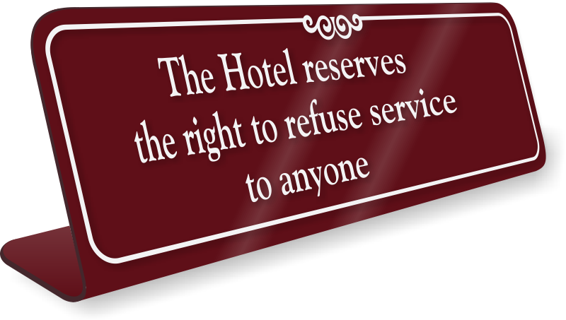 Place this table-top sign on the reception desk and stay away from any kind of dispute with your guests regarding service denial. Sign comes in three color options.
