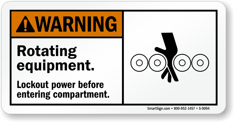 Rotating equipment in a room can surprise a worker with its speed or trajectory. Warn workers to lockout power by posting this ANSI notice sign.