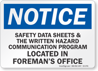 OSHA Notice Sign: Safety Data Sheets & The Written Hazard Communication Program Located In Foreman's Office S2-2741