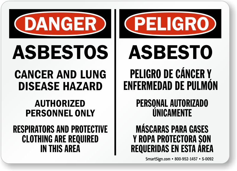 Bilingual OSHA Danger / Peligro Sign: Asbestos - Cancer and Lung Disease Hazard Authorized Personnel Only Respirators and Protective Clothing Are Required In This Area Learn More...