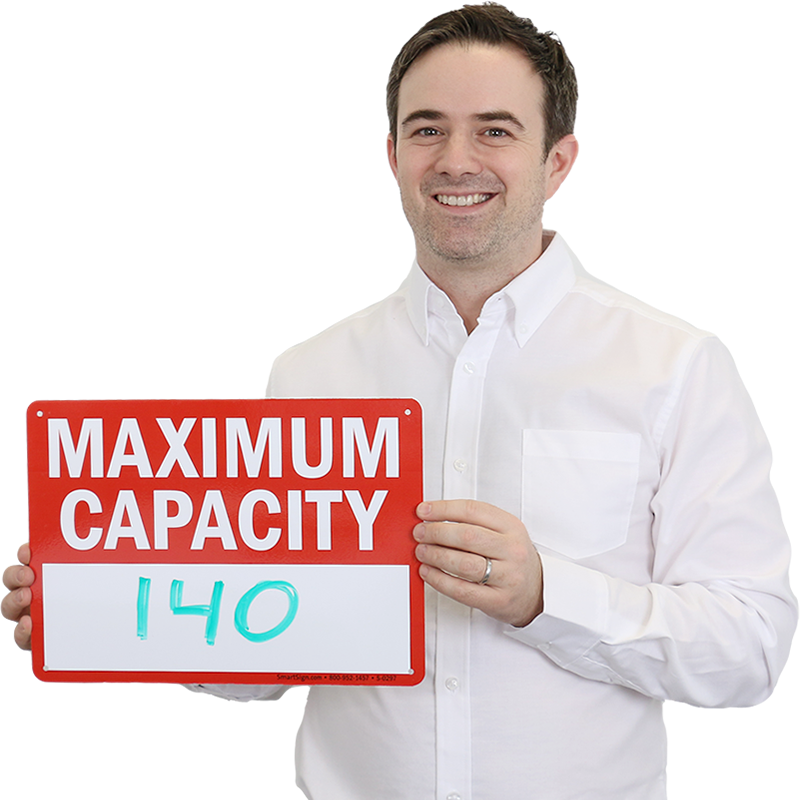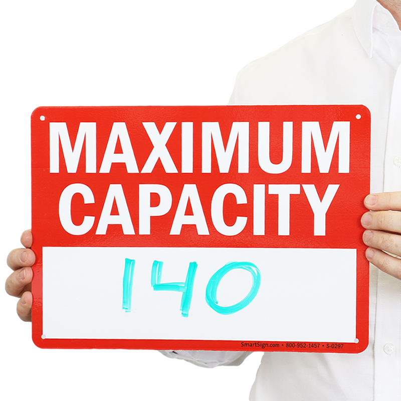 Solid metal design. Basic and to the point. Enough white space to write in what is needed (with a sharpie) if you want to put more than just the max capacity number.