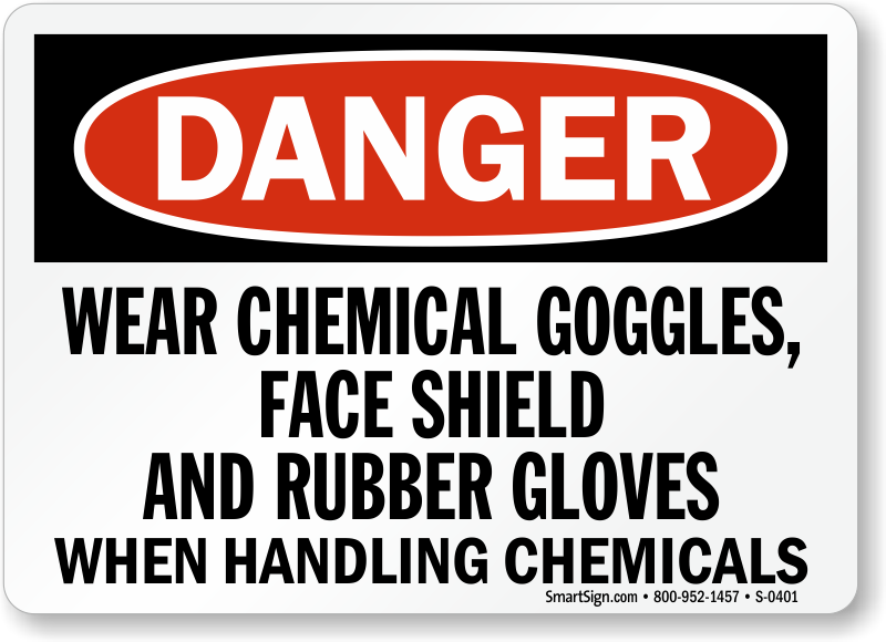 Use a "wear chemical goggles, face shield and rubber gloves when handling chemicals" sign.