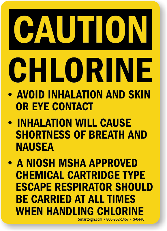 Stop chemical exposure. Use a "chlorine • avoid inhalation and skin or eye contact • inhalation will cause shortness of breath and nausea • a niosh msha approved chemical cartridge type escape respirator should be carried at all times when handling chlorine" sign.