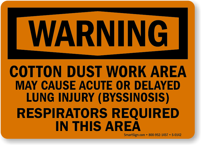 Comply with legal requirements. Use a "cotton dust work area may cause acute or delayed lung injury (byssinosis) respirators required in this area" sign.